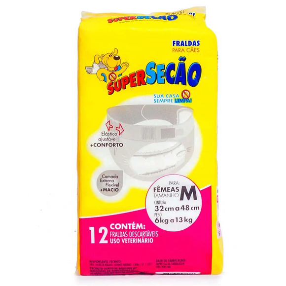 Fralda Descartável para Fêmea Super Secão Petix 12 unidadesA Fralda Descartável para Fêmea Super Secão Petix 12 unidades foi desenvolvida especialmente para cães operados em reabilitação com continência urinária fêmeas em período de cio e até mesmo para passeios e viagens.A fralda é revestida com tecido suave seu fecho de fita adesiva com tecnologia estilo velcro evita que a fralda saia com o movimento do pet ou grude no pelo. Possui matéria-prima em duas camadas extra gel e barreiras laterais anti-vazamento com costura de ponta a ponta para assegurar máxima absorção.Seu design de última geração com cinta ajustável e de largura grande se adequa perfeitamente ao corpo do animal proporcionando todo conforto necessário durante o uso.As fraldas estão disponíveis nos tamanhos:PP – Cintura de 20 a 28cm (Peso: de 1kg a 3kg)P – Cintura de 28 a 40cm (Peso: de 3kg a 6kg)M – Cintura de 32 a 48cm (Peso: de 6kg a 13kg)G – Cintura de 38 a 56cm (Peso: de 13kg a 20kg)Cada embalagem contém 12 unidades.