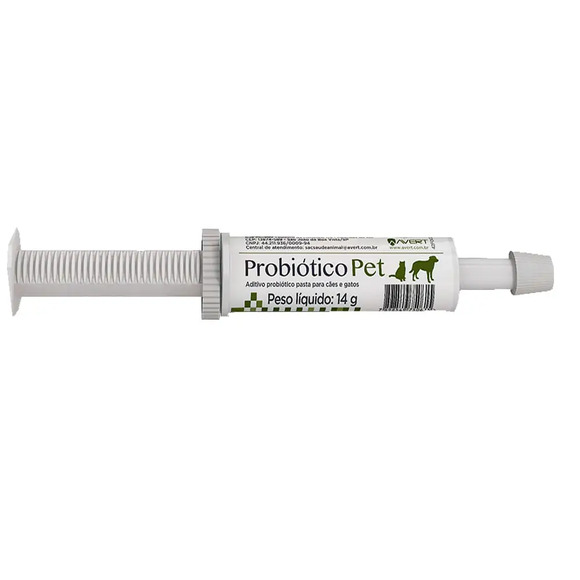 Probiótico Pet para Cães e Gatos AvertO Probiótico Pet para Cães e Gatos Avert é um medicamento indicado para cães e gatos de todas as idades e que estejam precisando fazer o uso de uma suplementação com micro-organismos vivos para o equilíbrio da microbiota intestinal.Para que serve o probiótico pet?A fórmula deste suplemento é composta por Lactobacillus acidophilus e Enterococcus faecium e tem como objetivo recompor e equilibrar a flora intestinal do seu pet. Dessa forma o produto age com muita eficácia e rapidez evitando diarréias alimentares e outros tipos de desconforto intestinal.Quando dar o Aditivo Probiótico Pet Avert?Por ser uma fonte de nutrição intestinal bem completa o Probiótico para cachorro e gatos pode ser oferecido em situações de desmame mudanças de rotina ração e/ou ambiente e períodos de vacinação e medicações. Dessa forma o produto pode ser utilizado desde o nascimento até a velhice do seu pet.Qual a dosagem do probiótico pet?Está com dúvida sobre quantas vezes posso dar probiótico para cães? Segundo as informações na bula probiótico Avert o uso deve ser via oral. Com o auxílio de uma seringa administre a quantidade correta indicada pelo médico-veterinário.Caso seja necessário e aprovado por um profissional repita a dose. Normalmente as doses recomendadas são:2 g por dia: animais de pequeno porte e/ou filhotes.4 g por dia: animais adultos de porte médio e grande.Níveis de GarantiaEm 14 g de Produto:Enterococcus faecium17 x 108UFCLactobacillus acidophilus17 x 108UFCVeículo q.s.p14 gCuidados e AdvertênciasJamais faça o uso de medicamentos sem antes consultar um médico-veterinário. Apenas um profissional é capaz de orientar corretamente quanto ao melhor tratamento para o seu animal de estimação.Dessa forma o médico-veterinário deve te informar sobre a frequência e dosagem ideal para o pet sendo que é extremamente importante o uso regular do Aditivo Probiótico Pet Avert observando os horários prescritos.Mantenha o produto na embalagem original para facilitar a identificação e o controle da validade. Não deixe o medicamento aberto ou exposto ao sol e não guarde com produtos tóxicos. Além disso mantenha fora do alcance de crianças e animais.Caso você tenha mais dúvidas leia as informações descritas na bula do probiótico para cão e gato da Avert ou peça mais orientações ao médico-veterinário do seu pet.ATENÇÃO! Uso proibido na alimentação de Ruminantes.Onde comprar o Probiótico Pet Avert 14g?Você encontra o Aditivo Probiótico Pet Avert com preço imperdível e todos os medicamentos necessários para o cuidado com seus animais de estimação aqui na . Aproveite o nosso pet shop online!