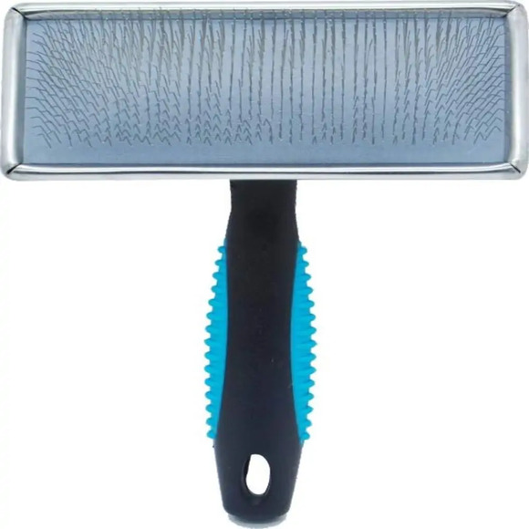 A Rasqueadeira Clássica Reta Média Azul Propetz possui pinos de aço cujas pontas terminam em ângulo de 45 graus que tornam a escovação mais eficiente para desembaraçar nós e remover pelos mortos de animais com pelagens médias ou longas.Possui design inovador com chapa em aço inoxidável. O cabo de borracha promove a rasqueadeira mais conforto e suavidade proporcionando firmeza e controle na pressão exercida contra a pele ao segurar. Os pinos são de aço inoxidável proporcionando excelentes resultados de higiene com menos esforço. É a rasqueadeira mais usada dentro do banho &. tosa.Material: Plástico ABS que é resistente leve flexível e isolante elétrico.Instruções para uso:Passe gentilmente a Rasqueadeira ProPetz Clássica na direção de crescimento da pelagem. Repita até o pelo estar totalmente desembaraçado. Indicada também para fazer o pelo ficar mais volumoso durante o ato de secagem.A PROPETZ desenvolve produtos de alto padrão com durabilidade e resistência incomparáveis. Reconhecido no mercado como referência do segmento pet profissional visando sempre a satisfação dos consumidores mais exigentes que buscam produtos com qualidade conforto valor e um design diferenciado gerando assim uma experiência única.USE E ENCANTE-SE!Composição: Plástico Aço e Borracha.TAMANHO DA PARTE DAS CERDAS: 11x5cmTamanho total com o cabo: A15cm x L11Cm