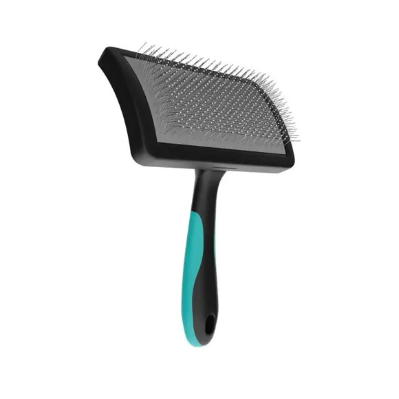 A Rasqueadeira Curva C/ Pinos de Bolinha Grande ProPetz é  um acessório indispensável para o seu Pet Shop  possui um design inovador com cantos arredondados.Além de alisar o pelo do animalzinho proporciona uma massagem agradável na pele sem risco de machucar devido aos seus pinos em aço inoxidável flexíveis e com a ponta protegida com pinos emborrachados. Contém cabo emborrachado com alças antiderrapantes que proporcionam uma pegada mais confortável e firme.